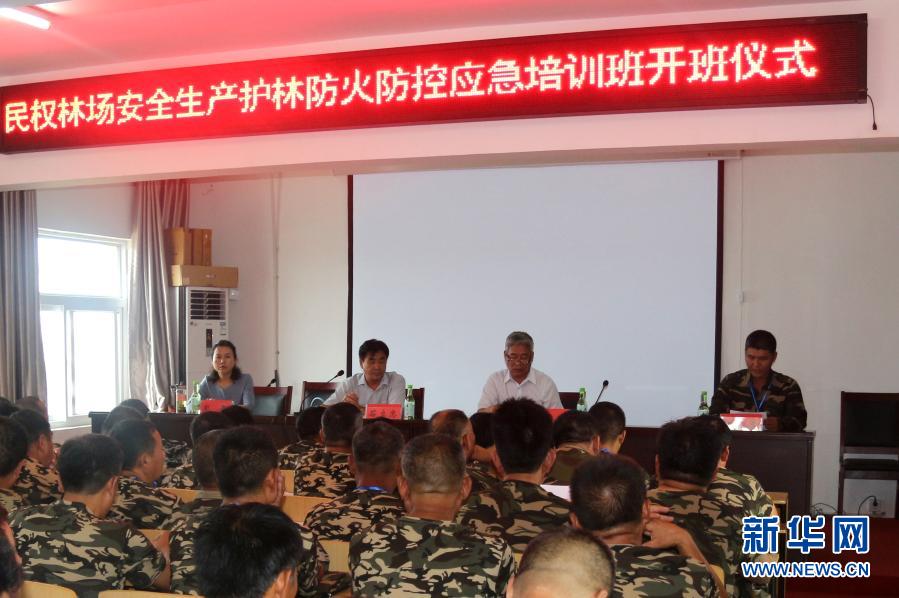 石立忠(臺(tái)上左二)和翟文杰(臺(tái)上右一)在民權(quán)林場(chǎng)安全生產(chǎn)護(hù)林防火防控應(yīng)急培訓(xùn)班開班儀式上(資料照片)。新華社發(fā)