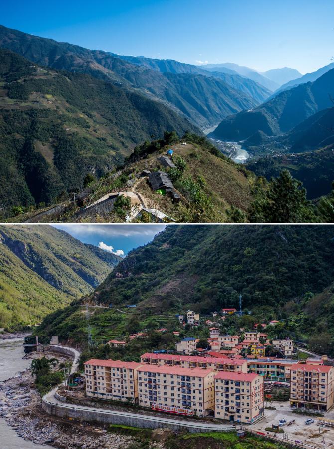上圖是云南省福貢縣匹河怒族鄉(xiāng)托坪村一景(2016年11月25日攝);下圖是搬遷到怒江邊的托坪村五湖易地扶貧搬遷安置點(diǎn)新村(11月3日攝,無人機(jī)照片)。新華社記者 胡超 攝