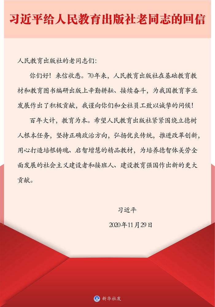 習(xí)近平給人民教育出版社老同志回信強(qiáng)調(diào) 緊緊圍繞立德樹人根本任務(wù) 用心打造培根鑄魂啟智增慧的精品教材