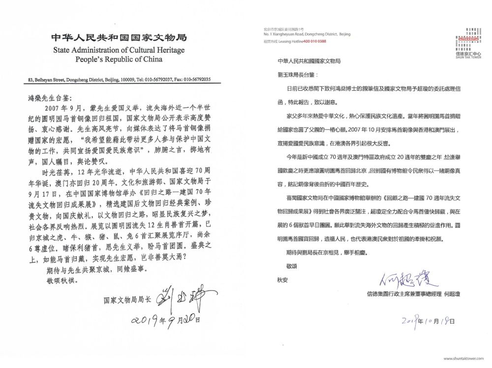 2019年11月,為慶祝中華人民共和國(guó)成立70周年和澳門回歸20周年,在國(guó)家文物局積極溝通協(xié)調(diào)下,何鴻燊先生決定將圓明園馬首銅像正式捐贈(zèng)國(guó)家文物局。