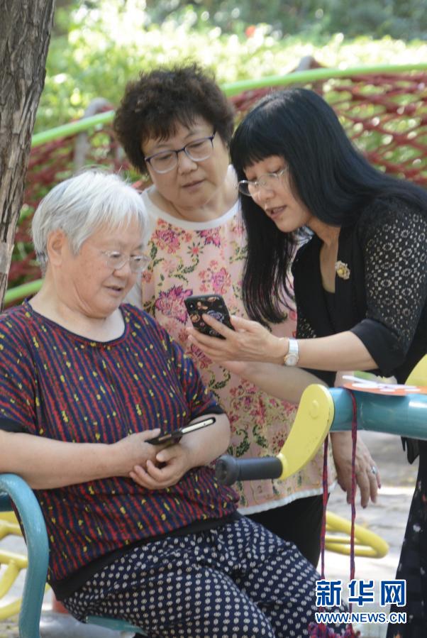 龍澤苑社區(qū)黨支部書(shū)記、居委會(huì)主任伊然(右)在社區(qū)內(nèi)教老年人使用手機(jī)里的社區(qū)服務(wù)軟件(8月10日攝)。新華社記者 李欣 攝