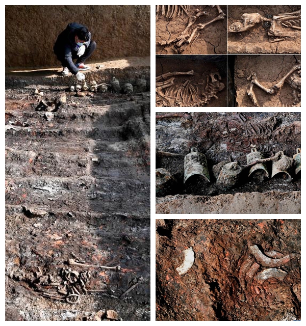 左圖為工作人員在清理河南洛陽徐陽墓地標(biāo)號為M15的墓葬;右上圖為河南洛陽徐陽墓地標(biāo)號為M15的墓葬周邊祭祀遺存內(nèi)出土的動物遺?。挥抑袌D為河南洛陽徐陽墓地標(biāo)號為M15的墓葬出土的編鐘;右下圖為河南洛陽徐陽墓地標(biāo)號為M15的墓葬出土的玉璜