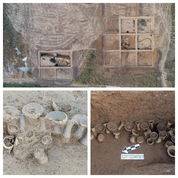 上圖為余莊遺址發(fā)掘區(qū)航拍圖(11月3日攝,無人機照片);左下圖為余莊遺址標(biāo)號為T0405的探方出土的陶器;右下圖為余莊遺址標(biāo)號為M10的墓葬出土的隨葬陶器