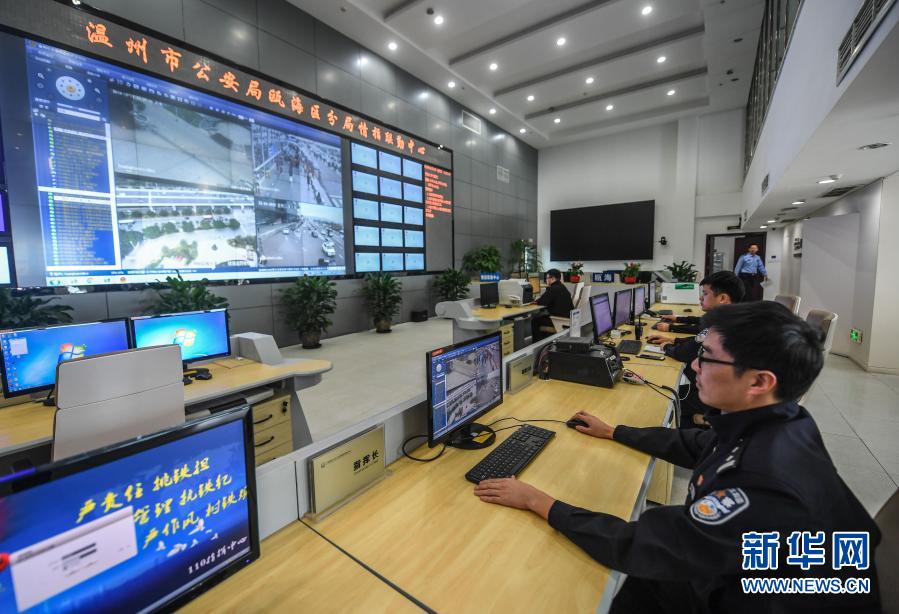 浙江省溫州市甌海區(qū)公安分局指揮中心內(nèi),警務(wù)人員在后臺(tái)實(shí)時(shí)監(jiān)控各類(lèi)動(dòng)態(tài)信息(2018年11月14日攝)。該局依托互聯(lián)網(wǎng)大數(shù)據(jù)等新手段,打造管理新模式,全面提升了警務(wù)效能。新華社記者 徐昱 攝
