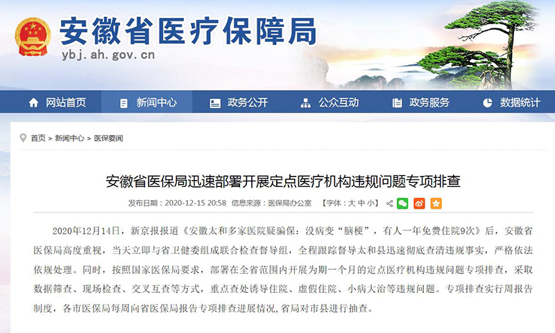 據(jù)安徽省醫(yī)保局網(wǎng)站消息,2020年12月14日,新京報(bào)報(bào)道《安徽太和多家醫(yī)院疑騙保:沒病變“腦梗”,有人一年免費(fèi)住院9次》后,安徽省醫(yī)保局高度重視,當(dāng)天立即與省衛(wèi)健委組成聯(lián)合檢查督導(dǎo)組,全程跟蹤督導(dǎo)太和縣迅速?gòu)氐撞榍暹`規(guī)事實(shí),嚴(yán)格依法依規(guī)處理。