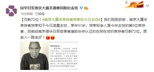 侵華日軍南京大屠殺遇難同胞紀(jì)念館18日發(fā)布消息,南京大屠殺幸存者賀孝和于2020年12月18日凌晨去世,享年91歲。