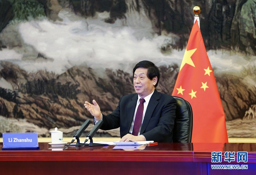 12月21日,全國人大常委會委員長栗戰(zhàn)書在北京人民大會堂以視頻方式同韓國國會議長樸炳錫舉行會談。新華社記者 張領 攝