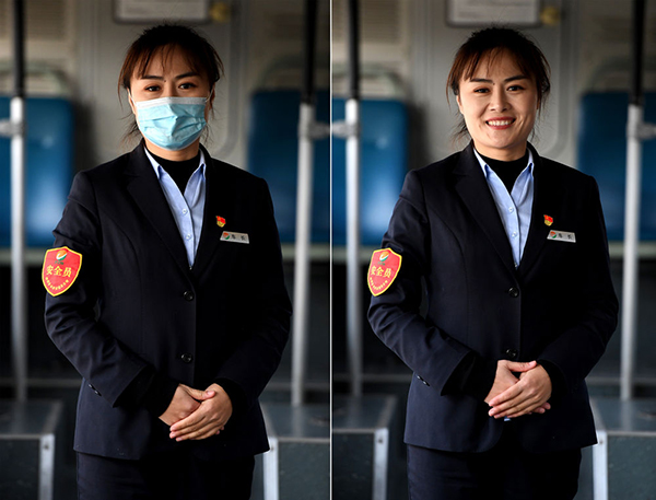 這是12月18日拍攝的鄭州公交二公司B38路公交車車長黃菲肖像(拼版照片)。