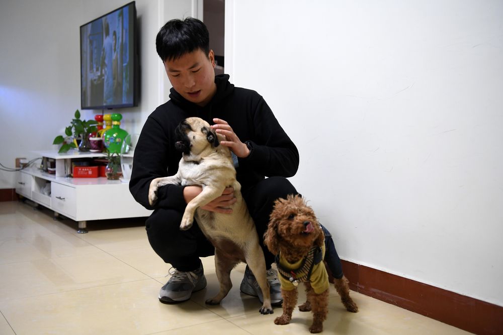 ??12月18日,孫浩在家里和寵物狗玩耍。