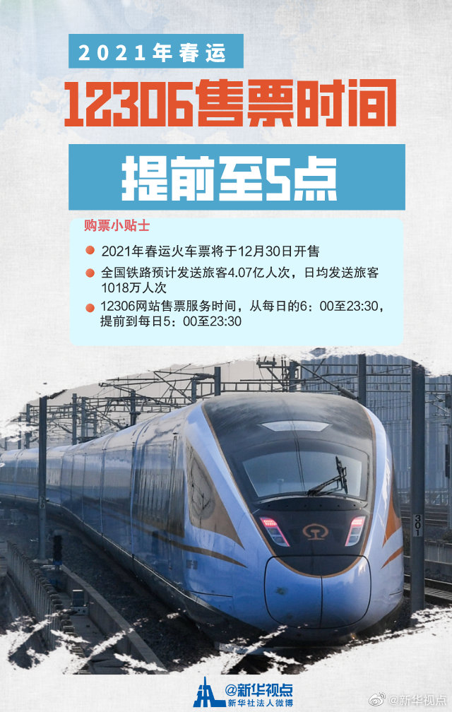 2021年鐵路春運(yùn)自1月28日開始,3月8日結(jié)束,共40天,全國(guó)鐵路預(yù)計(jì)發(fā)送旅客4.07億人次,日均發(fā)送旅客1018萬(wàn)人次。據(jù)悉,鐵路部門將鐵路12306網(wǎng)站售票服務(wù)時(shí)間從每日的6:00至23:30,提前到每日5:00至23:30;同步12306網(wǎng)站和線下窗口改簽規(guī)則,線上也可改簽乘車當(dāng)日24點(diǎn)前其他列車車票。(記者樊曦、周圓)?