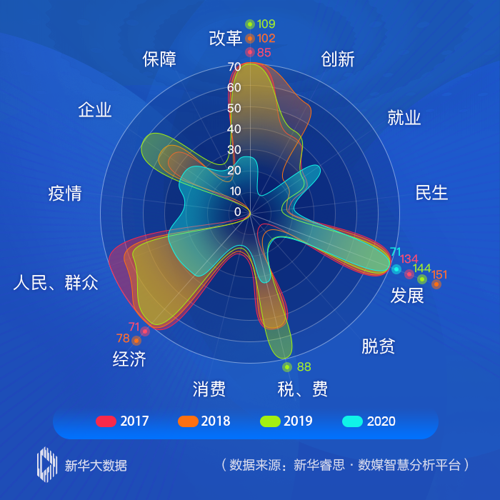政府工作報告出爐,字斟句酌有多用心?新華睿思對2017年至2020年四年的政府工作報告進行了文本語義分析。四年來,政府工作報告圍繞“發(fā)展”“改革”“經(jīng)濟”進行了全面的闡述和工作部署,回應(yīng)群眾關(guān)切,堅持把人民群眾的利益放在第一位。