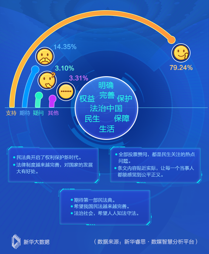 新華睿思數(shù)據(jù)顯示,近八成網(wǎng)民對(duì)民法典草案表示支持和肯定,認(rèn)為“民法典開啟了權(quán)利保護(hù)新時(shí)代”“法治中國(guó)給老百姓帶來(lái)實(shí)實(shí)在在的好處”。從話題熱詞分析來(lái)看,“法治中國(guó)”“完善”“保護(hù)”三大熱詞有效地呼應(yīng)了編纂民法典的出發(fā)點(diǎn)和落腳點(diǎn)。
