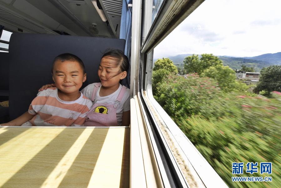 2020年8月14日,吳思語(yǔ)(右)帶著弟弟吳思遠(yuǎn)乘坐“小慢車”前往西昌走親戚。穿越四川涼山彝族自治州往返于普雄和攀枝花之間的5633/5634次列車,全列13節(jié)車廂,走滿全程353公里需要9個(gè)多小時(shí)。慢悠悠的火車沿途要停靠26個(gè)站,如同一座流動(dòng)的村莊,盡自己最大能力解決沿途百姓出行問(wèn)題。