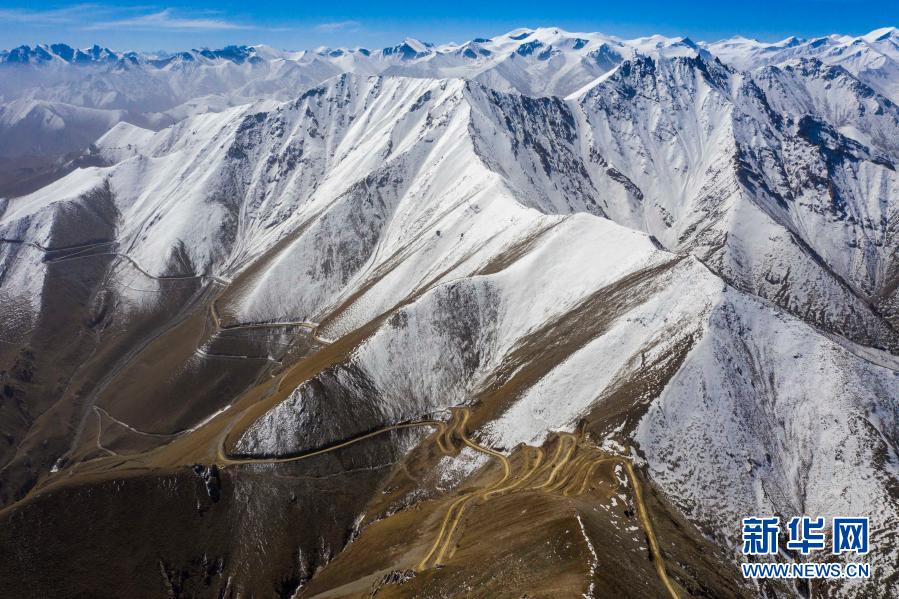 這是2020年5月1日拍攝的通往新疆喀什地區(qū)葉城縣西合休鄉(xiāng)亞爾阿格孜村的道路蜿蜒在崇山峻嶺間(無人機(jī)照片)。
