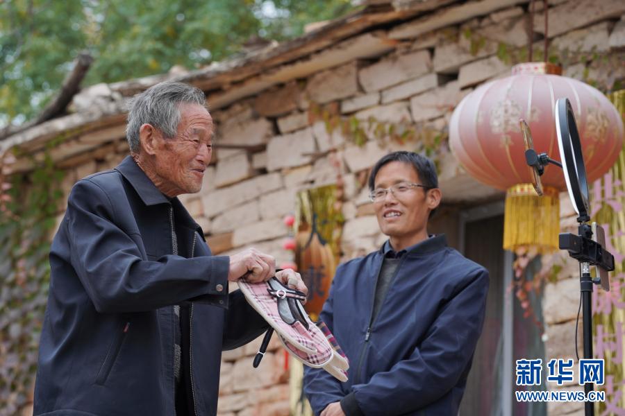 2020年10月28日,河北省沙河市柴關(guān)鄉(xiāng)大康村老支書(shū)李三平(左)在直播中推介村民手工制作的布鞋。今年年初,李三平在兒子李慶斌直播推介農(nóng)產(chǎn)品的過(guò)程中,應(yīng)網(wǎng)友的要求加入直播,收獲了眾多網(wǎng)友點(diǎn)贊。在他的努力下,大康村的小米、蜂蜜等貨品銷路越來(lái)越廣,慕名前來(lái)的游客也更多了。
