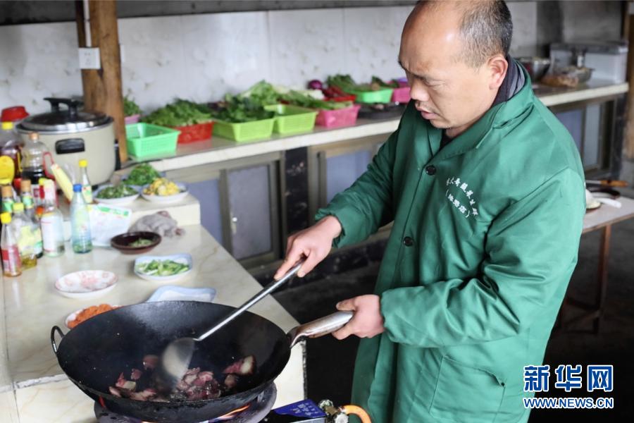 2月2日,在湖南省湘西土家族苗族自治州花垣縣十八洞村,楊正邦在炒臘肉。 新華社記者 陳思汗 攝