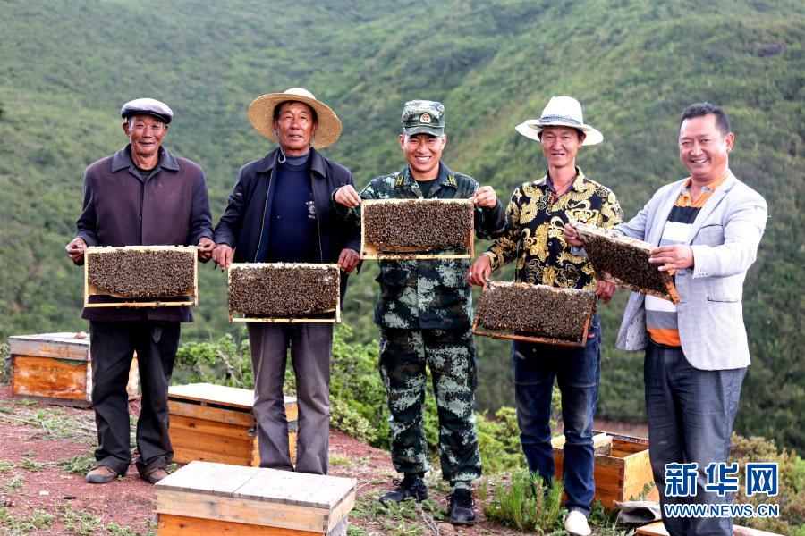 武警四川總隊(duì)涼山支隊(duì)精準(zhǔn)幫扶昭覺(jué)縣梭梭拉打村發(fā)展養(yǎng)蜂產(chǎn)業(yè),總隊(duì)駐村扶貧干部布哈(中)和村民一同展示豐收成果(2019年6月12日攝)。新華社發(fā)(楊劍 攝)