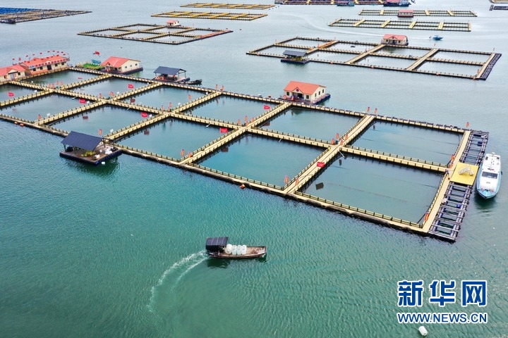 漁船駛過福建省寧德市三都澳大黃魚深水塑膠漁排養(yǎng)殖區(qū)(無人機(jī)照片,2020年7月15日攝)。新華社記者姜克紅攝