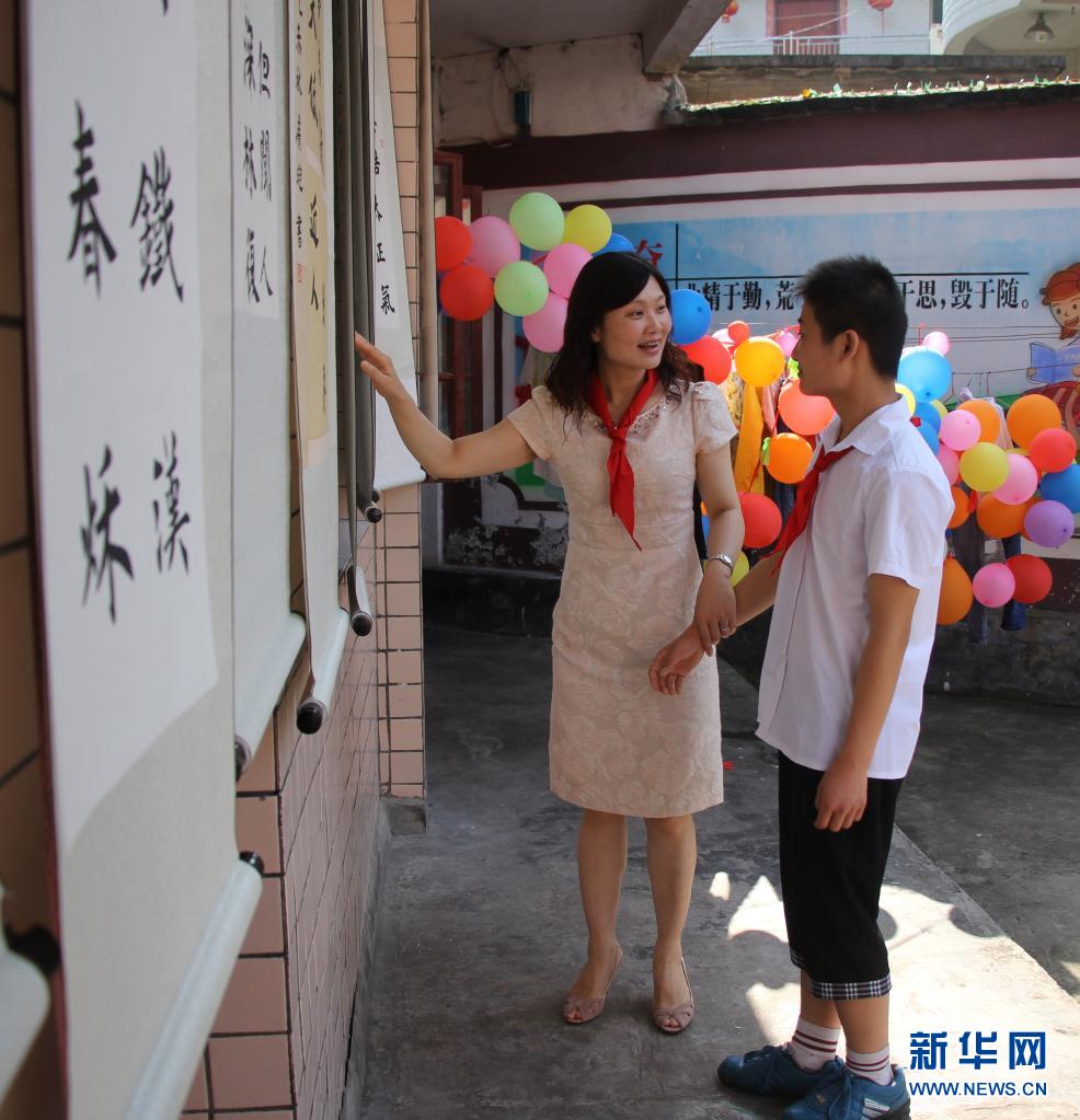 田艷(左)在貴州省印江縣特殊教育學校觀看孩子們的書畫作品(2016年6月1日攝)。新華社發(fā)