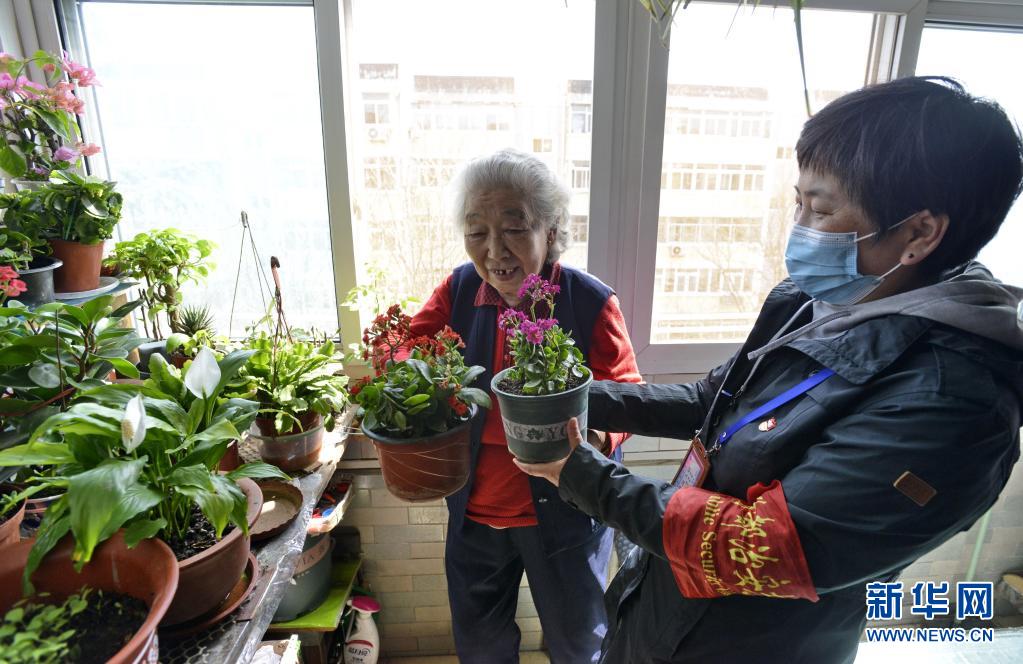 北京市豐臺(tái)區(qū)東高地街道黨員志愿者馮春紅(右)上門看望社區(qū)內(nèi)高齡老人王康鳳,了解老人居家生活情況(2020年4月1日攝)。新華社記者 李欣 攝