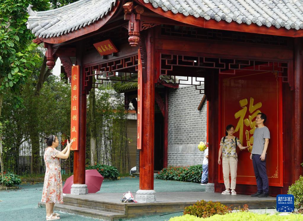 游客在成都市郫都區(qū)戰(zhàn)旗村拍照留念(8月8日攝)。新華社發(fā)(郭芯屹 攝)