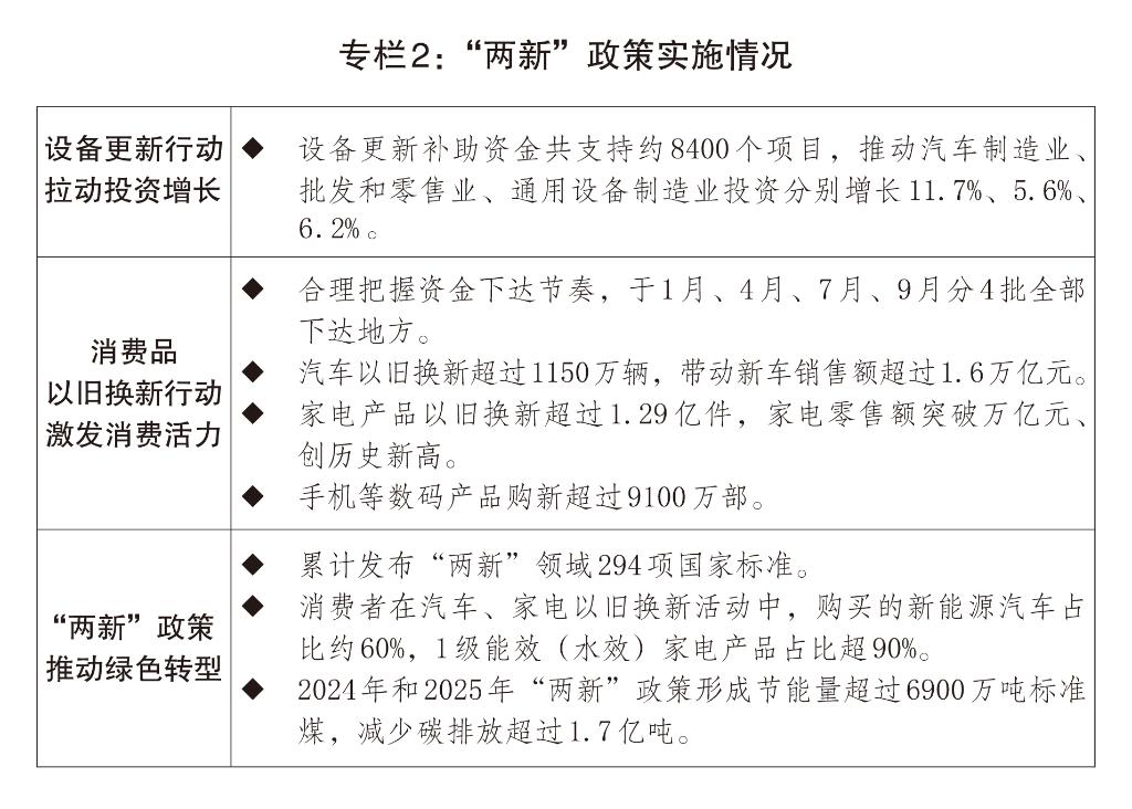 一是政策组合拳协同增效。适时推出稳就业稳经济推动高质量发展的若干举措,支持稳岗就业、稳定外贸、促进消费、扩大投资。发行超长期特别国债1.3万亿元、新增地方政府专项债券4.4万亿元,安排7350亿元中央预算内投资,安排5000亿元地方政府债务结存限额用于补充地方政府综合财力和扩大有效投资,发行5000亿元特别国债补充大型商业银行核心一级资本,投放新型政策性金融工具补充重点项目资本金。下调存款准备金率50个基点。下调政策利率10个基点,全年全国新发放企业贷款加权平均利率比上年下降41个基点。支持小微企业融资协调工作机制高效运行,截至2025年底新发放贷款30.4万亿元。用好结构性货币政策工具,设立债券市场“科技板”。年末广义货币供应量(M2)余额、社会融资规模存量分别增长8.5%、8.3%。“一业一策、一企一策”加大对外贸行业企业支持力度,扩大出口信用保险承保规模和覆盖面。加快内外贸一体化发展,推进产销对接。