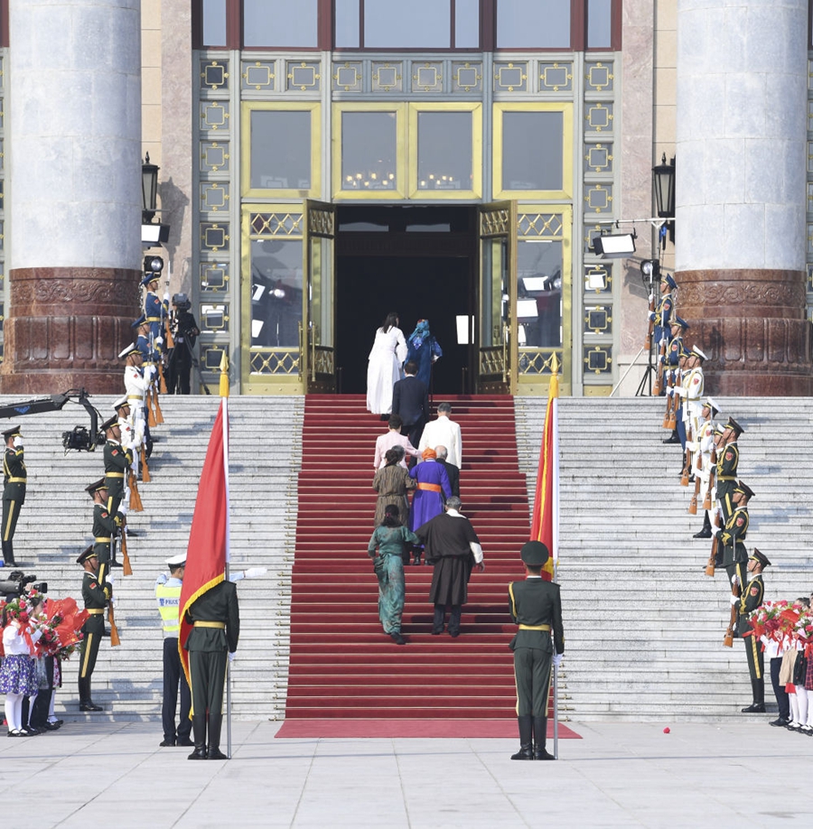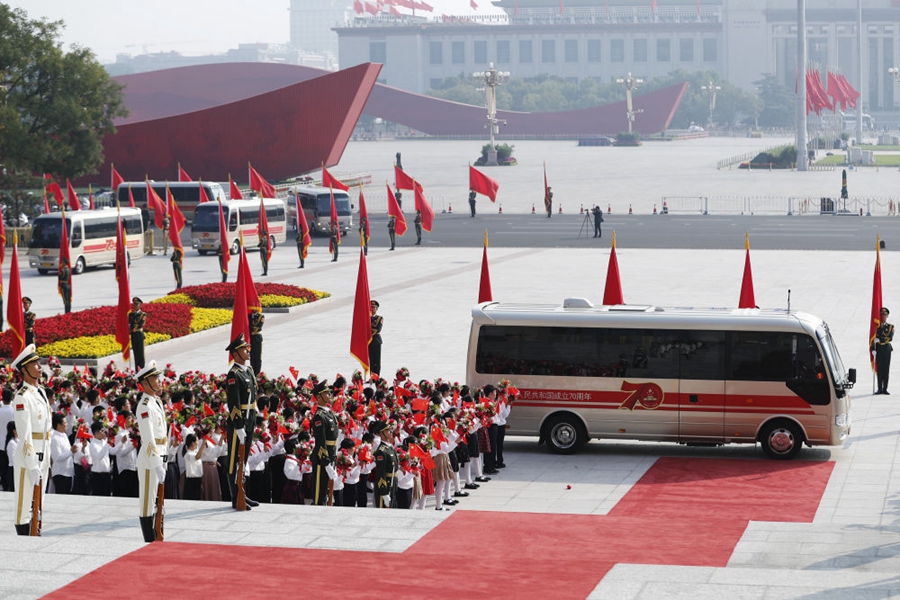 人民大會堂東門外,高擎紅旗的禮兵分列道路兩側,肩槍禮兵在臺階上莊嚴佇立。車隊抵達時,早已迎候在這里的青少年們迸發(fā)出熱情的歡呼。