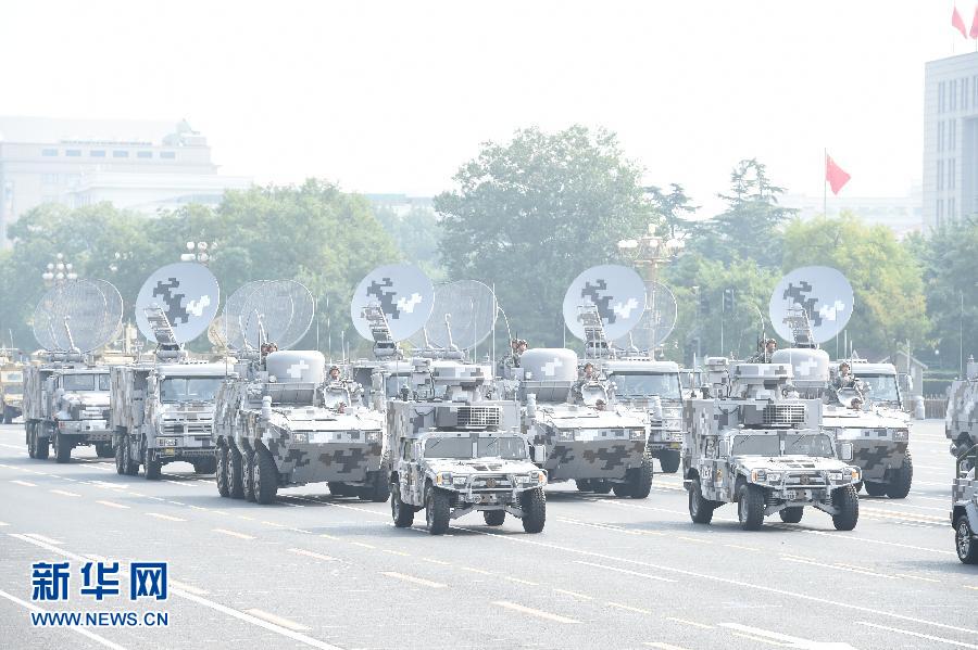 新華社北京10月1日電(記者李國利、李兵峰)身披數(shù)碼城市迷彩、高擎通信天線,由16輛國產(chǎn)新型裝備組成的信息作戰(zhàn)第3方隊(duì),1日上午在孫寶泰少將、景賢舫少將的率領(lǐng)下整齊劃一通過天安門。