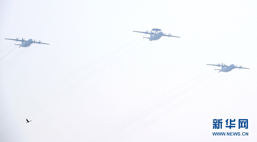 在海上巡邏機梯隊中,1架空警-500H預警機、2架運-8反潛巡邏機組成的品字形編隊飛行在梯隊前方,緊隨其后的是1架空警-200H預警機和2架運-8技術偵察機。