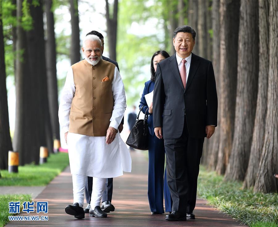 4月27日和28日,國(guó)家主席習(xí)近平在武漢東湖賓館同印度總理莫迪舉行非正式會(huì)晤。這是4月28日,習(xí)近平同莫迪散步交談。 新華社記者 燕雁攝