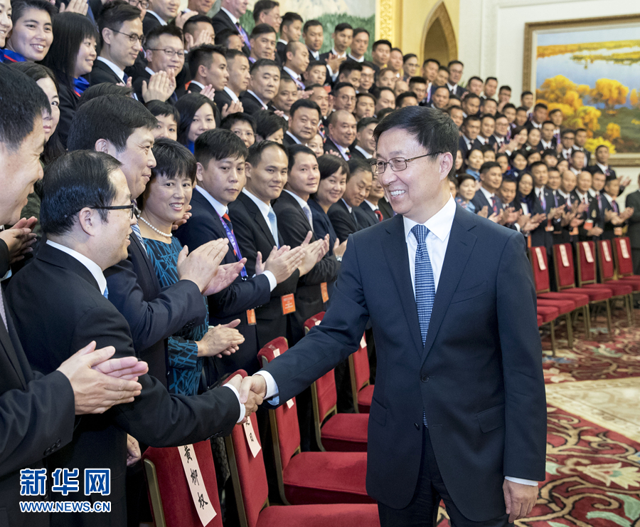 8月27日,中共中央政治局常委、國務(wù)院副總理韓正在北京人民大會堂會見香港特別行政區(qū)保安局局長李家超率領(lǐng)的香港紀律部隊文化交流團全體成員。 新華社記者王曄攝
