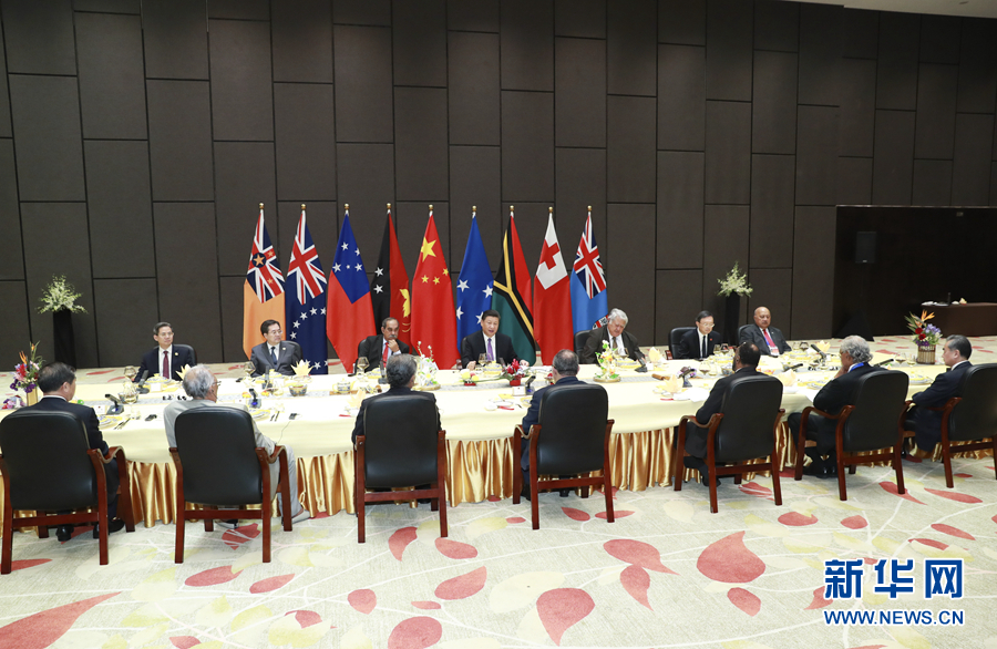 11月16日,國(guó)家主席習(xí)近平在莫爾茲比港同巴布亞新幾內(nèi)亞總理奧尼爾、密克羅尼西亞聯(lián)邦總統(tǒng)克里斯琴、薩摩亞總理圖伊拉埃帕、瓦努阿圖總理薩爾瓦伊、庫(kù)克群島總理普納、湯加首相波希瓦、紐埃總理塔拉吉等建交太平洋島國(guó)領(lǐng)導(dǎo)人以及斐濟(jì)政府代表、國(guó)防部長(zhǎng)昆布安博拉舉行集體會(huì)晤。習(xí)近平主持會(huì)晤并發(fā)表主旨講話(huà)。 新華社記者 龐興雷 攝