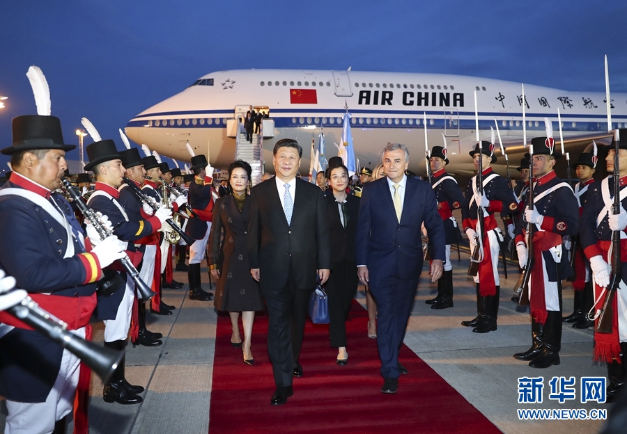 當(dāng)?shù)貢r(shí)間20時(shí)05分許,習(xí)近平乘坐的專機(jī)抵達(dá)布宜諾斯艾利斯埃塞伊薩國(guó)際機(jī)場(chǎng)。習(xí)近平和夫人彭麗媛受到阿根廷外交部長(zhǎng)福列、胡胡伊省省長(zhǎng)莫拉萊斯等熱情迎接。儀仗隊(duì)長(zhǎng)趨前致敬,軍樂(lè)團(tuán)奏響雄勁有力的進(jìn)行曲,習(xí)近平和彭麗媛沿紅地毯前行,禮兵分列紅地毯兩側(cè),行注目禮。