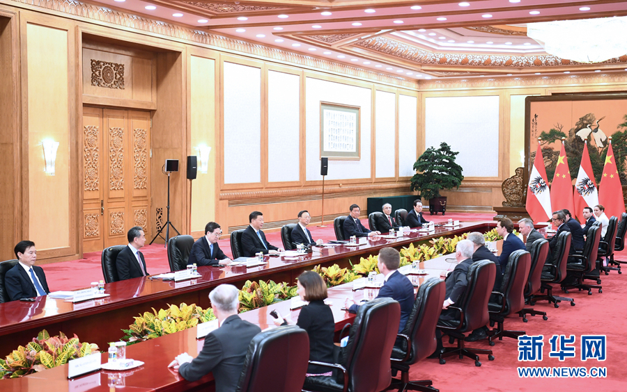 習(xí)近平指出,中方高度重視發(fā)展中奧關(guān)系。兩國友好戰(zhàn)略伙伴關(guān)系不斷得到充實。中奧合作潛力巨大,前景廣闊。雙方要堅持平等相待、相互尊重,不斷將雙邊關(guān)系推向新高度。要為加強兩國人文交流搭建更多平臺,促進(jìn)兩國民心相通。中方歡迎奧方積極參與共建“一帶一路”和“16+1合作”,贊賞奧方對中國投資展現(xiàn)的開放姿態(tài),歡迎奧地利企業(yè)抓住中國新一輪擴大開放帶來的機遇。