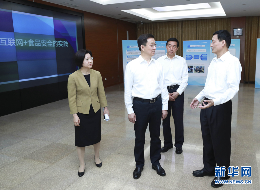 6月13日,在2019年全國(guó)食品安全宣傳周活動(dòng)前夕,中共中央政治局常委、國(guó)務(wù)院副總理、國(guó)務(wù)院食品安全委員會(huì)主任韓正到國(guó)務(wù)院食品安全委員會(huì)辦公室主持召開(kāi)座談會(huì),聽(tīng)取對(duì)食品安全工作的意見(jiàn)建議。這是會(huì)前,韓正參觀食品安全工作情況展示,考察了解食品安全智慧監(jiān)管的創(chuàng)新舉措。 新華社記者 龐興雷 攝