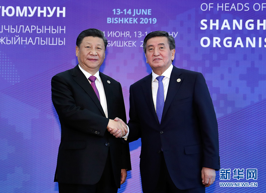 6月14日,國家主席習(xí)近平在吉爾吉斯斯坦首都比什凱克出席上海合作組織成員國元首理事會第十九次會議并發(fā)表重要講話。這是習(xí)近平抵達阿拉爾恰國賓館會議中心大廳,受到吉爾吉斯斯坦總統(tǒng)熱恩別科夫熱情迎接。 新華社記者 丁林 攝