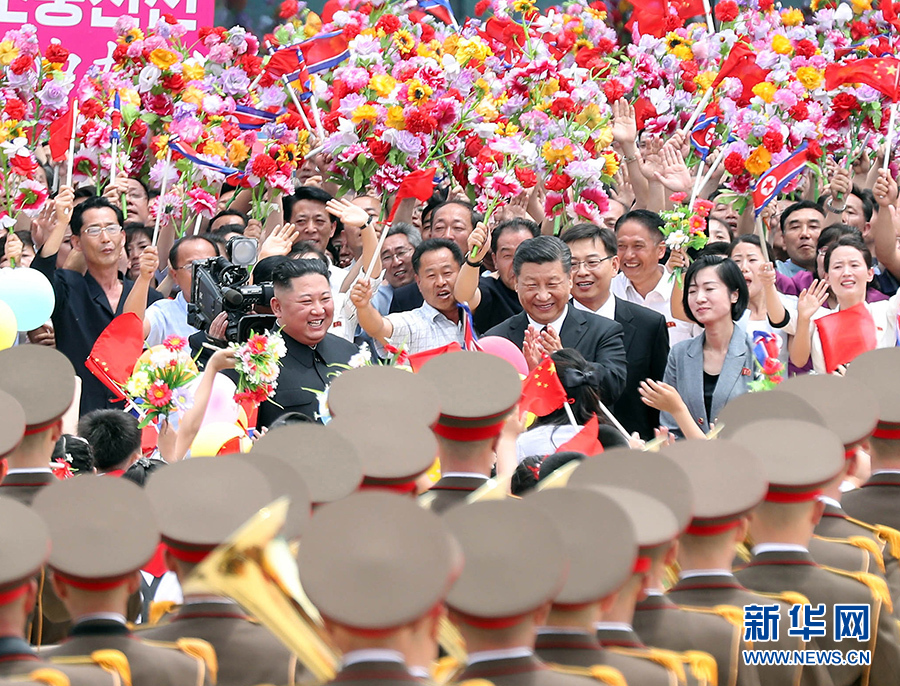 6月20日,中共中央總書記、國家主席習(xí)近平乘專機(jī)抵達(dá)平壤,開始對(duì)朝鮮民主主義人民共和國進(jìn)行國事訪問。朝鮮勞動(dòng)黨委員長、國務(wù)委員會(huì)委員長金正恩和夫人李雪主到機(jī)場熱情迎接習(xí)近平和夫人彭麗媛。朝方在機(jī)場舉行隆重歡迎儀式。歡迎儀式結(jié)束后,習(xí)近平與金正恩同車前往錦繡山太陽宮廣場,沿途數(shù)十萬群眾夾道歡迎。 新華社記者 申宏 攝