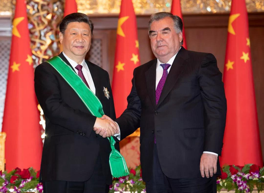 ↑熱恩別科夫總統(tǒng)和拉赫蒙總統(tǒng)分別向習(xí)主席授予各自國家最高獎(jiǎng)?wù)?,感謝習(xí)主席為發(fā)展吉中、塔中友誼所作的卓越貢獻(xiàn)。照片分別由新華社記者謝環(huán)馳、沙達(dá)提攝