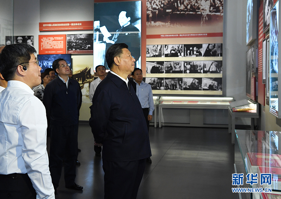 9月12日,中共中央總書記、國家主席、中央軍委主席習近平視察中共中央北京香山革命紀念地。這是習近平在香山革命紀念館參觀《為新中國奠基》主題展覽。 新華社記者 黃敬文 攝
