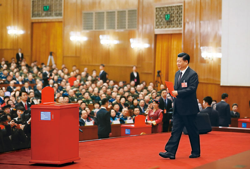 2018年3月17日,十三屆全國(guó)人大一次會(huì)議在北京人民大會(huì)堂舉行第五次全體會(huì)議。習(xí)近平當(dāng)選中華人民共和國(guó)主席、中華人民共和國(guó)中央軍事委員會(huì)主席。這是習(xí)近平準(zhǔn)備投票。 新華社記者 蘭紅光/攝