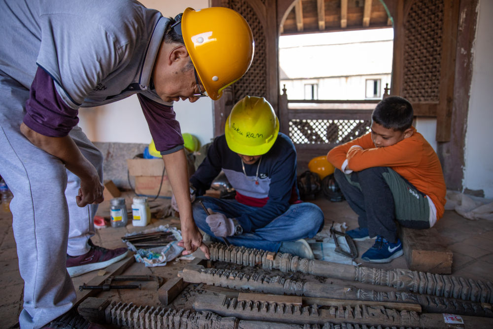 2019年10月10日,在尼泊爾加德滿都杜巴廣場(chǎng),中國(guó)文物修復(fù)師周建國(guó)(左)在九層神廟修復(fù)現(xiàn)場(chǎng)指導(dǎo)尼泊爾工人。新華社記者張可任攝
