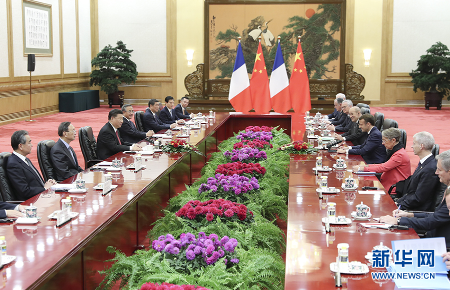 馬克龍表示,很高興在法中建交55周年之際再次訪華,我同習(xí)近平主席頻繁交往,深化了法中友誼和政治互信,有力推動(dòng)了務(wù)實(shí)合作。我完全贊同習(xí)近平主席對(duì)深化法中合作提出的看法。法中在許多重大國(guó)際問(wèn)題上持有相同立場(chǎng),在當(dāng)前國(guó)際形勢(shì)下,法中作為兩個(gè)大國(guó),負(fù)有特別重要的責(zé)任,法國(guó)加強(qiáng)同中國(guó)的對(duì)話和合作,具有重要示范作用。對(duì)雙方之間的一些分歧,法方愿本著相互尊重的精神妥善處理。法國(guó)企業(yè)熱切期待抓住中國(guó)擴(kuò)大對(duì)外開放的契機(jī),進(jìn)一步進(jìn)入中國(guó)市場(chǎng),擴(kuò)大對(duì)華農(nóng)產(chǎn)品出口,加強(qiáng)在航空、航天、民用核能等傳統(tǒng)領(lǐng)域合作,拓展科技創(chuàng)新、金融等領(lǐng)域合作。中方在法國(guó)發(fā)行歐元債券,這對(duì)法國(guó)具有重大意義。法方對(duì)中國(guó)企業(yè)赴法合作持開放態(tài)度,不會(huì)針對(duì)中國(guó)企業(yè)關(guān)上市場(chǎng)大門。法方愿推動(dòng)“一帶一路”同歐盟歐亞互聯(lián)互通戰(zhàn)略對(duì)接,共建綠色“一帶一路”。法中要擴(kuò)大人文交流,促進(jìn)文明互鑒。法中要共同維護(hù)多邊主義,在反恐、伊朗核等問(wèn)題上加強(qiáng)戰(zhàn)略溝通協(xié)調(diào),推動(dòng)世貿(mào)組織改革早日取得進(jìn)展。法中將共同發(fā)表《法中生物多樣性保護(hù)和氣候變化北京倡議》,兩國(guó)可以在這些重要問(wèn)題上發(fā)揮引領(lǐng)作用。在當(dāng)前充滿不確定性的世界里,歐盟深化對(duì)華合作至關(guān)重要,法方愿推動(dòng)歐中關(guān)系深入發(fā)展,加快歐中投資協(xié)定談判進(jìn)程。