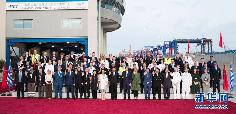 當(dāng)?shù)貢r(shí)間11月11日,國(guó)家主席習(xí)近平和夫人彭麗媛在希臘總理米佐塔基斯夫婦陪同下,共同參觀中遠(yuǎn)海運(yùn)比雷埃夫斯港項(xiàng)目。這是習(xí)近平夫婦和米佐塔基斯夫婦同中遠(yuǎn)當(dāng)?shù)貑T工等合影。 新華社記者 黃敬文 攝