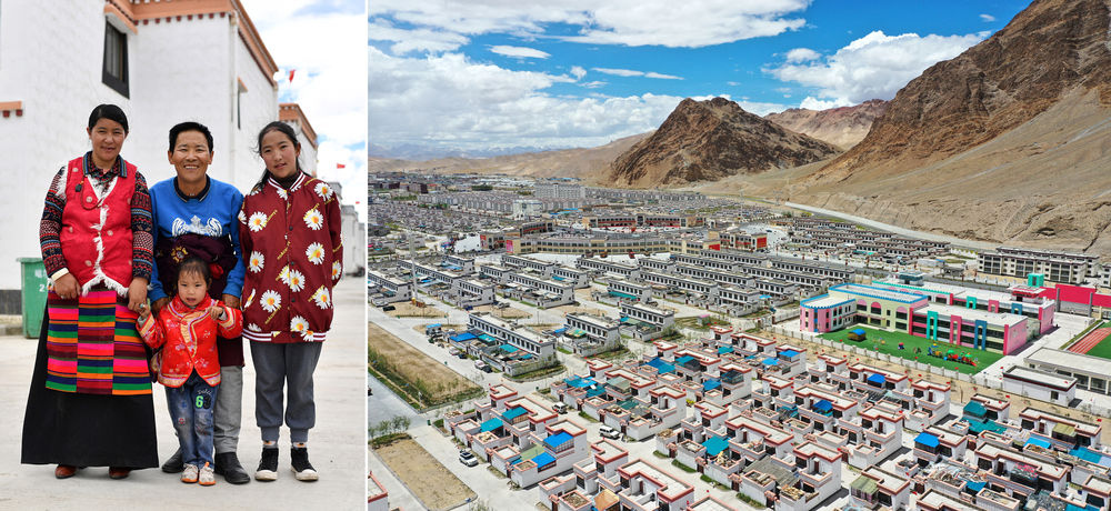 拼版照片:左圖為西藏阿里地區(qū)日土縣東汝鄉(xiāng)阿汝村村民丹木真一家在噶爾縣康樂(lè)新居易地扶貧搬遷安置點(diǎn);右圖為該搬遷安置點(diǎn)一角(無(wú)人機(jī)照片)。新華社記者 詹彥 攝