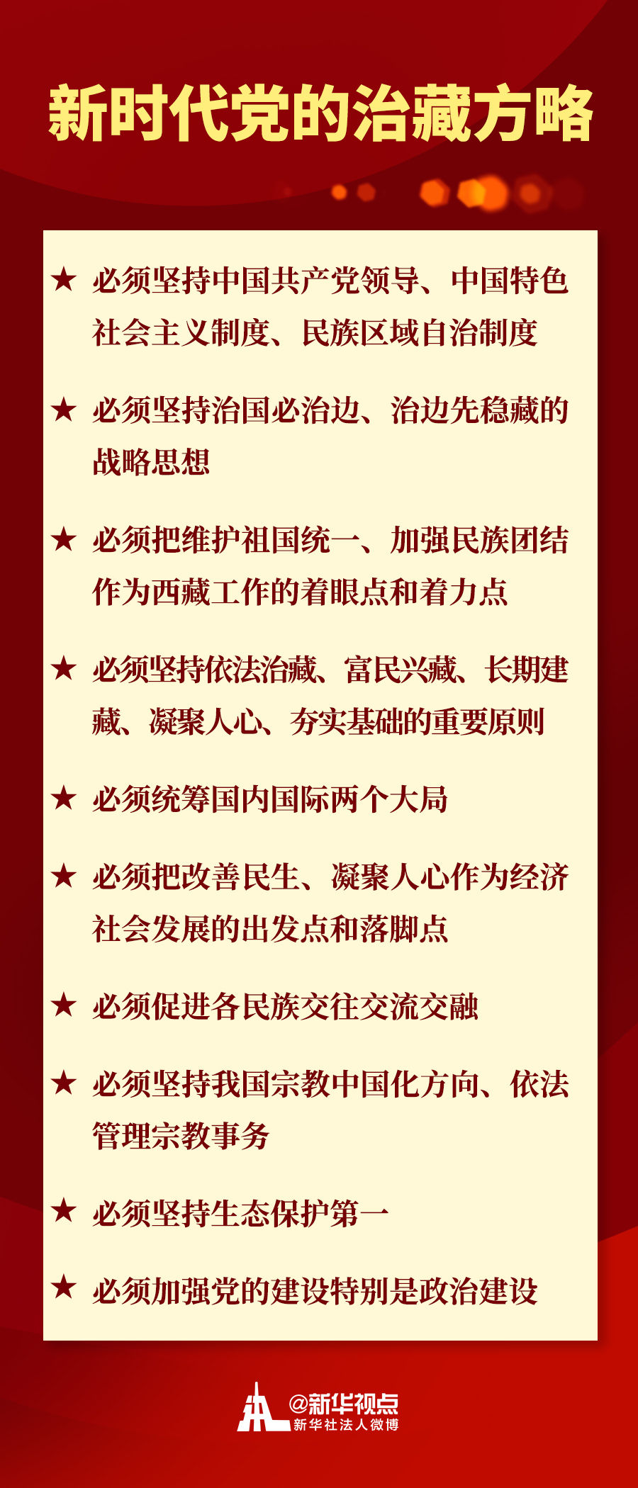 例如,明確提出“必須把維護(hù)祖國(guó)統(tǒng)一、加強(qiáng)民族團(tuán)結(jié)作為西藏工作的著眼點(diǎn)和著力點(diǎn)”;在過(guò)去表述基礎(chǔ)上,把“必須統(tǒng)籌國(guó)內(nèi)國(guó)際兩個(gè)大局”單列一條;進(jìn)一步提出“必須堅(jiān)持我國(guó)宗教中國(guó)化方向、依法管理宗教事務(wù)”;更加鮮明地提出“必須加強(qiáng)黨的建設(shè)特別是政治建設(shè)”。