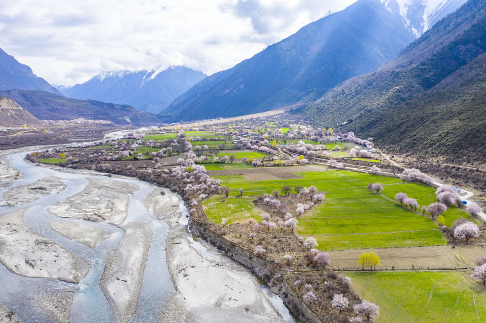 西藏林芝市波密縣境內(nèi)桃花盛開(kāi)的田園風(fēng)光(3月26日攝,無(wú)人機(jī)照片)。新華社記者 普布扎西 攝
