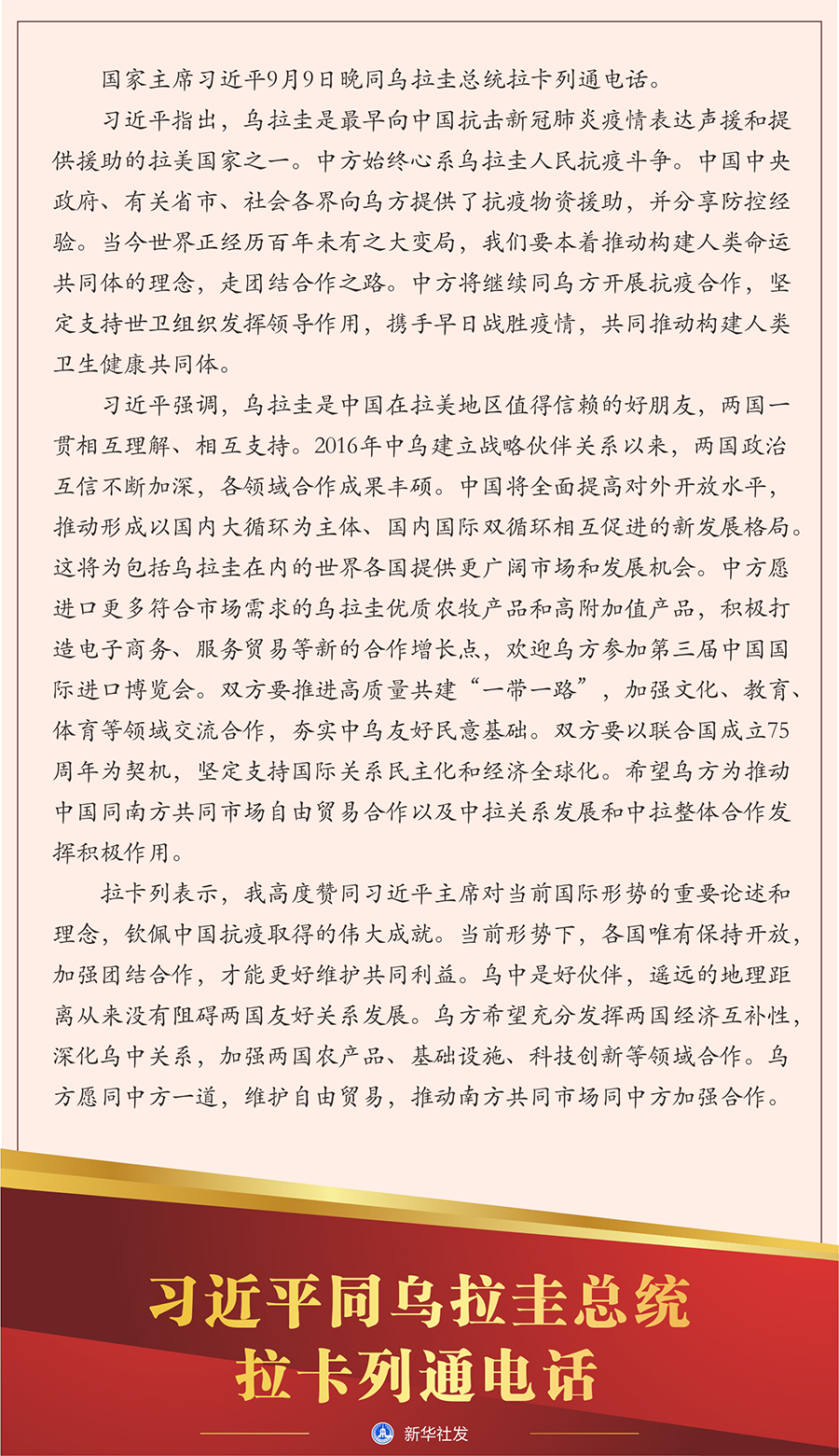 新華社北京9月9日電? 國(guó)家主席習(xí)近平9月9日晚同烏拉圭總統(tǒng)拉卡列通電話。