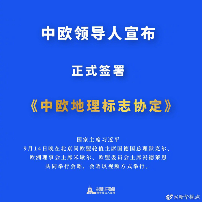 中歐領(lǐng)導(dǎo)人宣布正式簽署《中歐地理標(biāo)志協(xié)定》。 ????