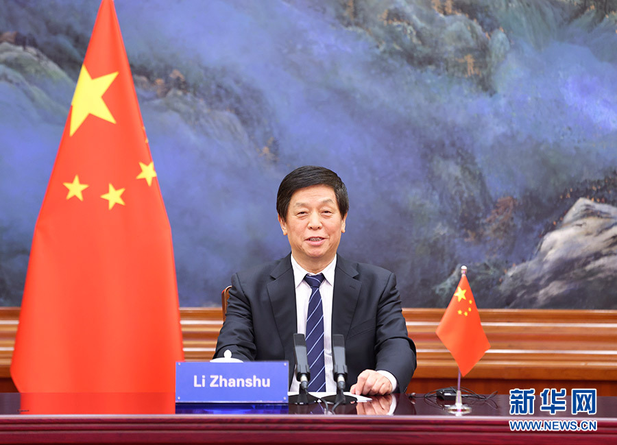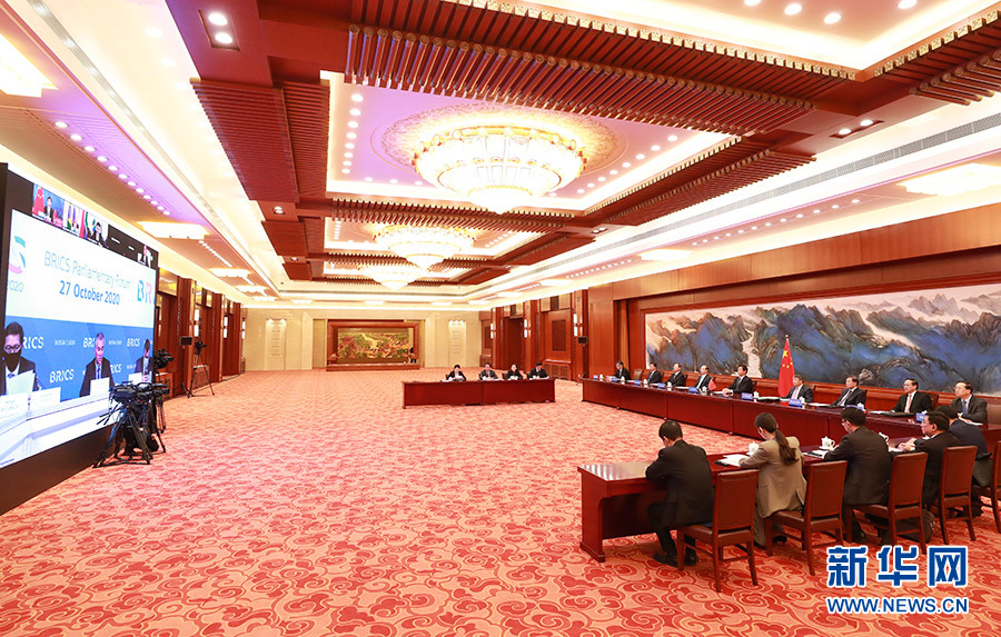 10月27日,全國人大常委會(huì)委員長栗戰(zhàn)書在北京人民大會(huì)堂出席第六屆金磚國家議會(huì)論壇視頻會(huì)議并發(fā)表講話。 新華社記者 龐興雷 攝