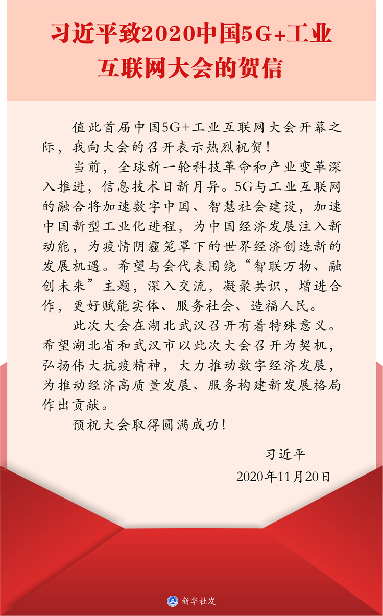 新華社武漢11月20日電 2020中國5G+工業(yè)互聯網大會20日在湖北省武漢市開幕。中共中央總書記、國家主席、中央軍委主席習近平發(fā)來賀信,向大會的召開表示熱烈祝賀。